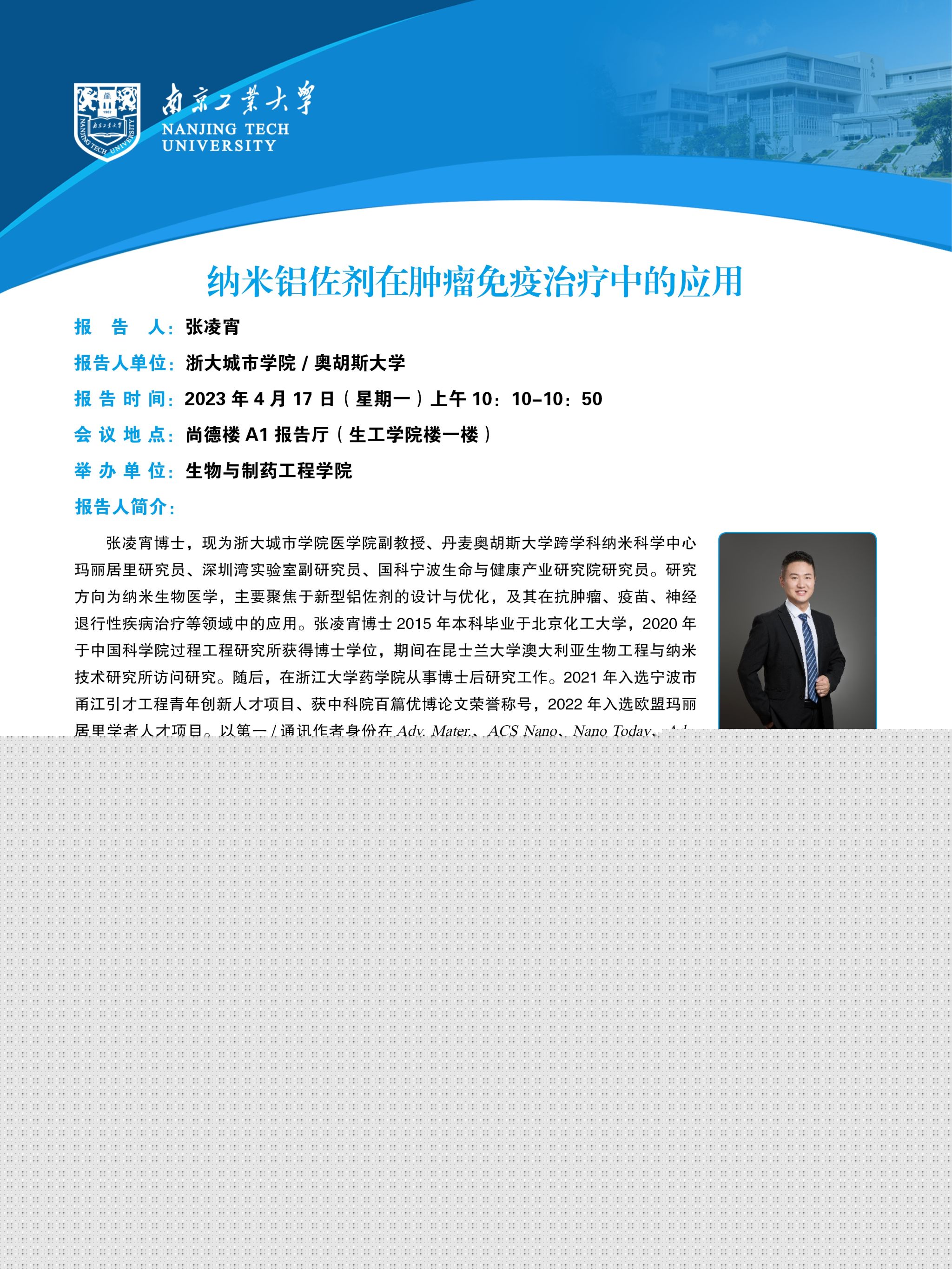 張凌宵博士,現(xiàn)為浙大城市學(xué)院醫(yī)學(xué)院副教授、丹麥奧胡斯大學(xué)跨學(xué)科納米科學(xué)中心瑪麗居里研究員、深圳灣實(shí)驗(yàn)室副研究員、國(guó)科寧波生命與健康產(chǎn)業(yè)研究院研究員。研究方向?yàn)榧{米生物醫(yī)學(xué),主要聚焦于新型鋁佐劑的設(shè)計(jì)與優(yōu)化,及其在抗腫瘤、疫苗、神經(jīng)退行性疾病治療等領(lǐng)域中的應(yīng)用。張凌宵博士2015年本科畢業(yè)于北京化工大學(xué),2020年于中國(guó)科學(xué)院過(guò)程工程研究所獲得博士學(xué)位,期間在昆士蘭大學(xué)澳大利亞生物工程與納米技術(shù)研究所訪問(wèn)研究。隨后,在浙江大學(xué)藥學(xué)院從事博士后研究工作。2021年入選寧波市甬江引才工程青年創(chuàng)新人才項(xiàng)目、獲中科院百篇優(yōu)博論文榮譽(yù)稱號(hào),2022年入選歐盟瑪麗居里學(xué)者人才項(xiàng)目。以第一/通訊作者身份在Adv. Mater.、ACS Nano、Nano Today、Adv. Drug Deliv. Rev.、J. Control. Release、Biomaterials等學(xué)術(shù)期刊發(fā)表SCI論文16篇。擔(dān)任J. Nanobiotech.客座編輯和Cancer Insight副主編。
