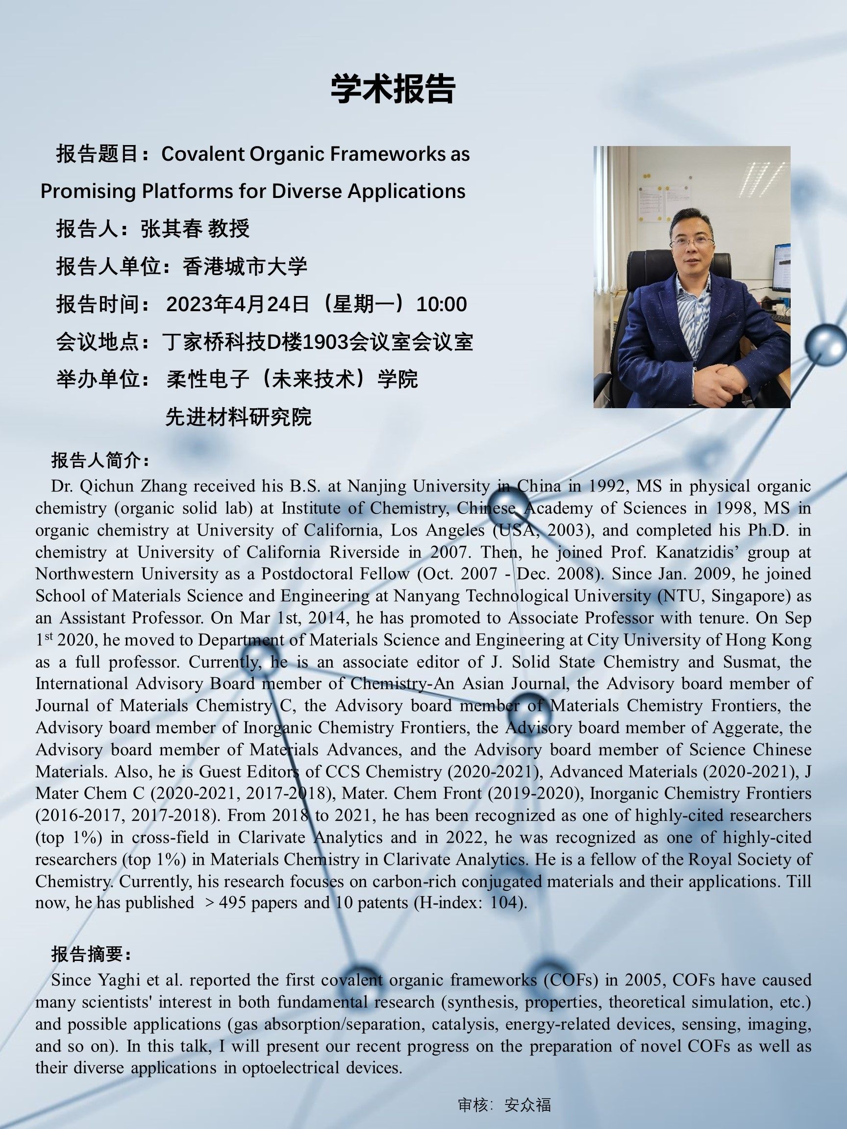報告人簡介:Dr. Qichun Zhang received his B.S. at Nanjing University in China in 1992, MS in physical organic chemistry (organic solid lab) at Institute of Chemistry, Chinese Academy of Sciences in 1998, MS in organic chemistry at University of California, Los Angeles (USA, 2003), and completed his Ph.D. in chemistry at University of California Riverside in 2007. Then, he joined Prof. Kanatzidis’ group at Northwestern University as a Postdoctoral Fellow (Oct. 2007-Dec. 2008). Since Jan. 2009, he joined School of Materials Science and Engineering at Nanyang Technological University (NTU, Singapore) as an Assistant Professor. On Mar 1st, 2014, he has promoted to Associate Professor with tenure. On Sep 1st2020, he moved to Department of Materials Science and Engineering at City University of Hong Kong as a full professor. Currently, he is an associate editor of J. Solid State Chemistry and Susmat, the International Advisory Board member of Chemistry-An Asian Journal, the Advisory board member of Journal of Materials Chemistry C, the Advisory board member of Materials Chemistry Frontiers, the Advisory board member of Inorganic Chemistry Frontiers, the Advisory board member of Aggerate, the Advisory board member of Materials Advances, and the Advisory board member of Science Chinese Materials. Also, he is Guest Editors of CCS Chemistry (2020-2021), Advanced Materials (2020-2021), J Mater Chem C (2020-2021, 2017-2018), Mater. Chem Front (2019-2020), Inorganic Chemistry Frontiers (2016-2017, 2017-2018). From 2018 to 2021, he has been recognized as one of highly-cited researchers (top 1%) in cross-field in Clarivate Analytics andin 2022, he was recognized as one of highly-cited researchers (top 1%) in Materials Chemistry in Clarivate Analytics. He is a fellow of the Royal Society of Chemistry. Currently, his research focuses on carbon-rich conjugated materials and their applications. Till now, he has published>495 papers and 10 patents (H-index: 104).