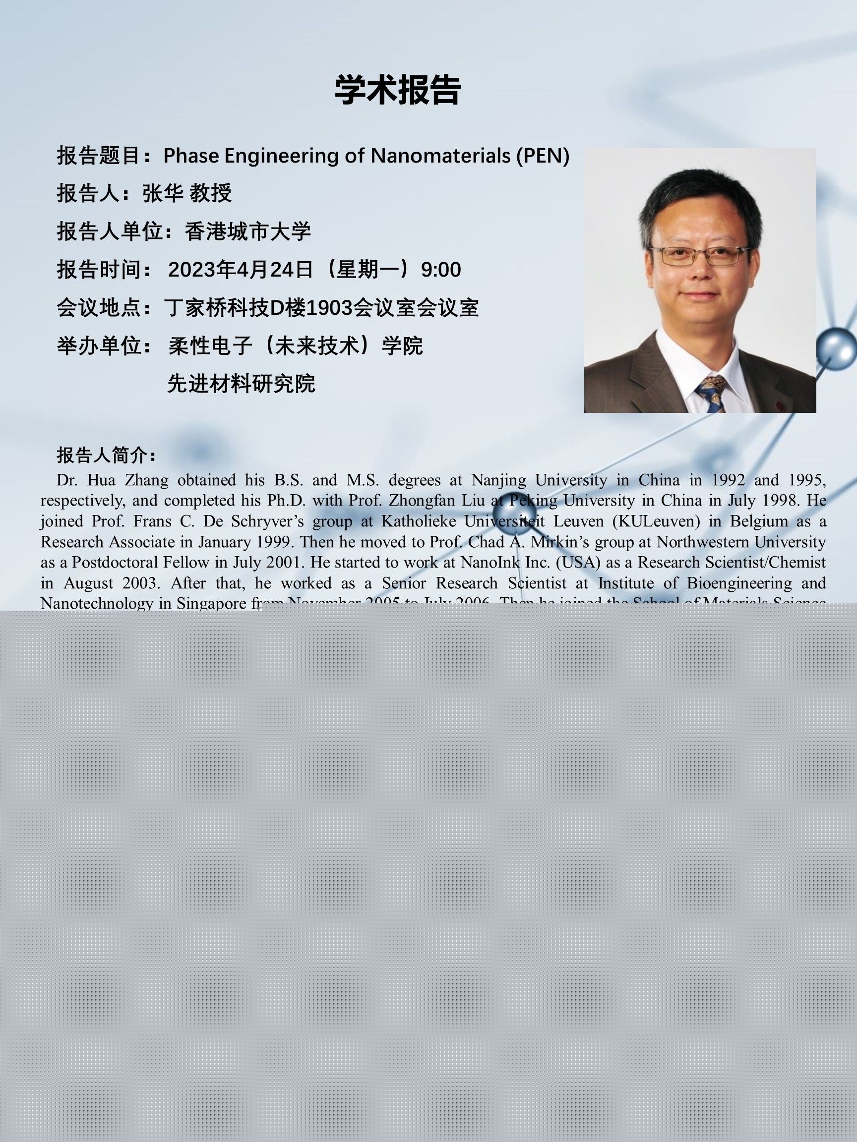 報告人簡介:Dr. Hua Zhang obtained his B.S. and M.S. degrees at Nanjing University in China in 1992 and 1995, respectively, and completed his Ph.D. with Prof. Zhongfan Liu at Peking University in China in July 1998. He joined Prof. Frans C. De Schryver’s group at Katholieke Universiteit Leuven (KULeuven) in Belgium as a Research Associate in January 1999. Then he moved to Prof. Chad A. Mirkin’s group at Northwestern University as a Postdoctoral Fellow in July 2001. He started to work at NanoInk Inc. (USA) as a Research Scientist/Chemist in August 2003. After that, he worked as a Senior Research Scientist at Institute of Bioengineering and Nanotechnology in Singapore from November 2005 to July 2006. Then he joined the School of Materials Science and Engineering in Nanyang Technological University (NTU) as an Assistant Professor. He was promoted to a tenured Associate Professor on March 1, 2011, and Full Professor on Sept. 1, 2013. In 2019, he joined the Department of Chemistry in City University of Hong Kong as a Chair Professor, and currently he is the Herman Hu Chair Professor of Nanomaterials.