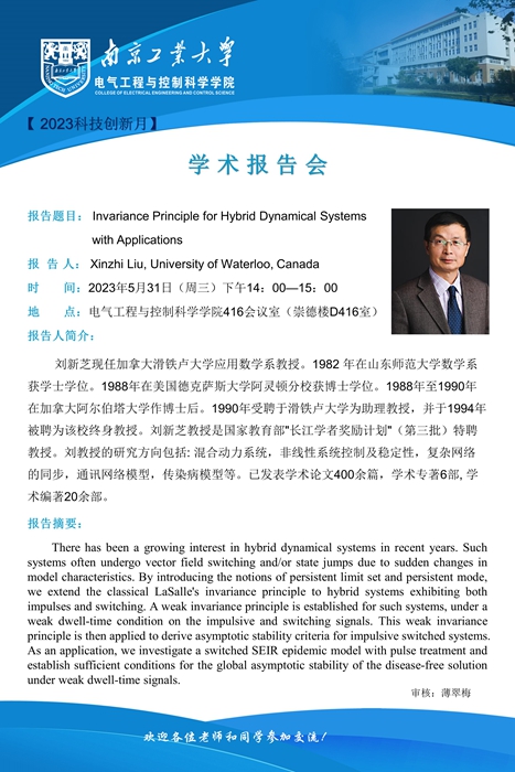 報告人簡介:劉新芝教授現任加拿大滑鐵盧大學應用數學系教授。1982年在山東師范大學數學系獲學士學位。1988年在美國德克薩斯大學阿靈頓分校獲博士學位。1988年至1990年在加拿大阿爾伯塔大學作博士后。1990年受聘于滑鐵盧大學為助理教授,并于1994年被聘為該校終身教授。劉教授的研究方向包括:混合動力系統,非線性系統控制及穩定性,復雜網絡的同步,通訊網絡模型,傳染病模型等。已發表學術論文400余篇,學術專著6部,學術編著20余部。