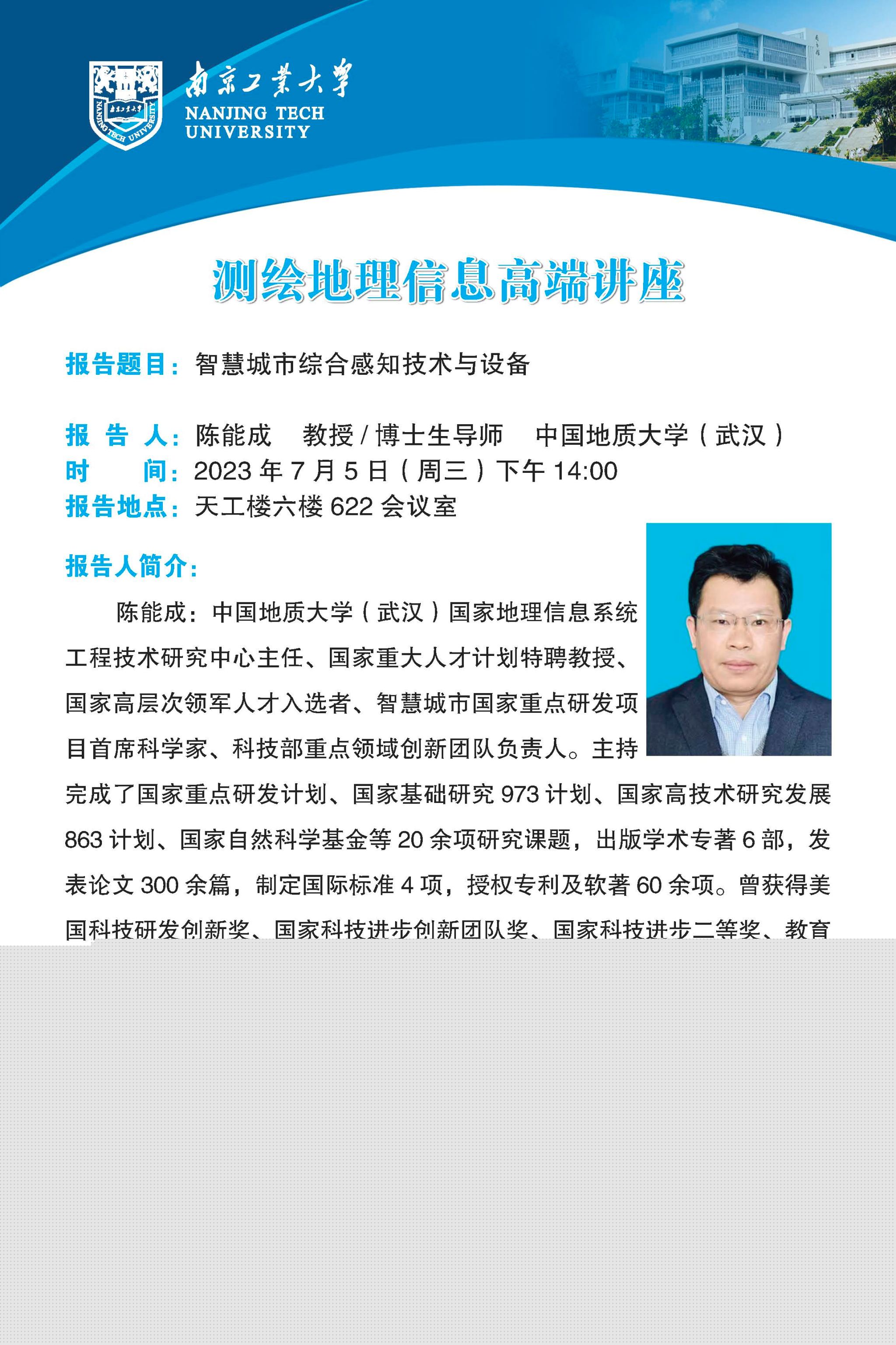 陳能成:教授、博士生導師,中國地質大學(武漢)國家地理信息系統工程技術研究中心主任、國家重大人才計劃特聘教授、國家高層次領軍人才入選者、智慧城市國家重點研發項目首席科學家、科技部重點領域創新團隊負責人。主持完成了國家重點研發計劃、國家基礎研究973計劃、國家高技術研究發展863計劃、國家自然科學基金等20余項研究課題,出版學術專著6部,發表論文300余篇,制定國際標準4項,授權專利及軟著60余項。曾獲得美國科技研發創新獎、國家科技進步創新團隊獎、國家科技進步二等獎、教育部自然科學一等獎、教育部科技進步一等獎、湖北省技術發明一等獎等13項獎勵。主要研究方向為對地觀測傳感網、智能地理信息系統、地理信息服務、智慧城市及智慧流域等。