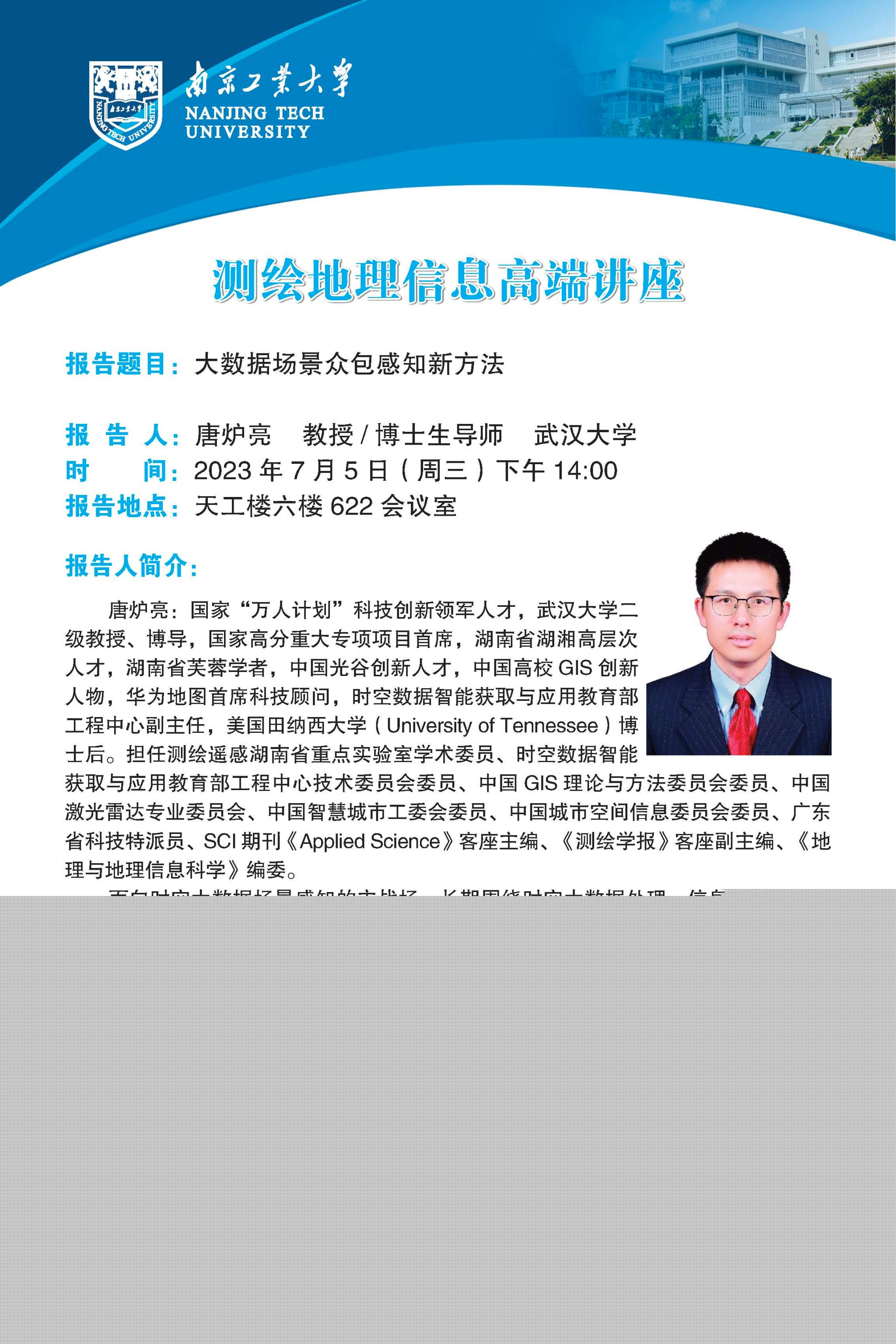 唐爐亮:武漢大學二級教授、博導,國家高分重大專項項目首席,湖南省湖湘高層次人才,湖南省芙蓉學者,中國光谷創新人才,中國高校GIS創新人物,華為地圖首席科技顧問,時空數據智能獲取與應用教育部工程中心副主任,美國田納西大學(University of Tennessee)博士后。擔任測繪遙感湖南省重點實驗室學術委員、時空數據智能獲取與應用教育部工程中心技術委員會委員、中國GIS理論與方法委員會委員、中國激光雷達專業委員會、中國智慧城市工委會委員、中國城市空間信息委員會委員、廣東省科技特派員、SCI期刊《Applied Science》客座主編、《測繪學報》客座副主編、《地理與地理信息科學》編委。