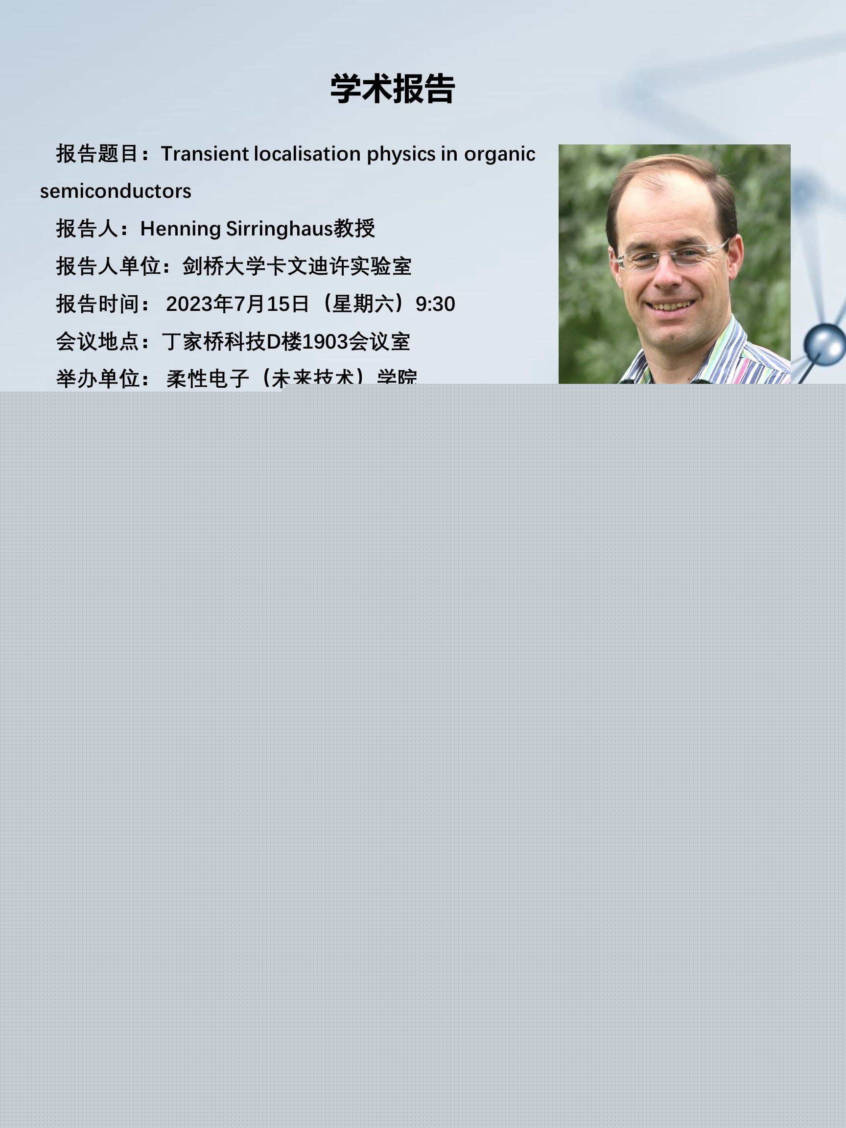 報告人簡介:Prof. Henning Sirringhaus, FRS is the Hitachi Professor of Electron Device Physics and a Royal Society Research Professor at the Cavendish Laboratory, University of Cambridge. He works on the charge transport, photo- and device physics of conjugated polymer and molecular semiconductors as well as hybrid organic-inorganic semiconductors.