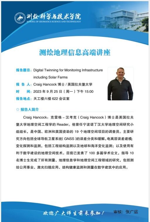 Craig Hancock:克雷格-漢考克(Craig Hancock)博士是英國拉夫堡大學地理空間工程學的Reader。他曾任寧波諾丁漢大學地理空間研究小組組長,是中國、歐洲和英國資助的19個地理空間項目的調查員。主要研究方向包括全球導航衛星系統(GNSS)的誤差分類和緩解電離層誤差建模變化探測和監測,包括工程結構監測以及地球和海洋變化監測;以及使用有利于數字建設的地理空間技術。目前已發表了100多篇學術論文,指導10名博士生完成了所有測量、地理信息學和地理空間工程領域的研究,包括測繪公用事業、激光掃描應用、結構健康監測和測量在數字建筑中的應用。