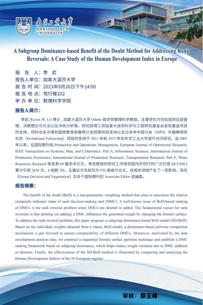 李武(Kevin W. Li)博士,加拿大溫莎大學Odette商學院管理科學教授。主要研究方向包括供應鏈管理、決策理論與方法以及沖突分析等。研究獲得三項加拿大自然科學與工程研究基金會發現基金項目的支持,同時也多次得到國家教育部春暉計劃短期項目支持以及日本學術振興會(JSPS)外籍聘用研究員(Invitational Fellowship)項目的支持于2011年和2015年到東京工業大學進行訪問研究。自2001年以來,在國際期刊如Production and Operations Management,European Journal of Operational Research, IEEE Transactions on Systems, Man, and Cybernetics: Part A, Information Sciences, International Journal of Production Economics, International Journal of Production Research, Transportation Research: Part E, WaterResources Research等發表69篇學術論文,李武教授的研究工作得到國內外同行的廣泛引用(SCI/SSCI累計引用2656次,h指數30),五篇論文先后列為ESI高被引論文,在相關領域產生了一定影響,現任《Group Decision and Negotiation》及多個國際期刊的Associate Editor或編委。