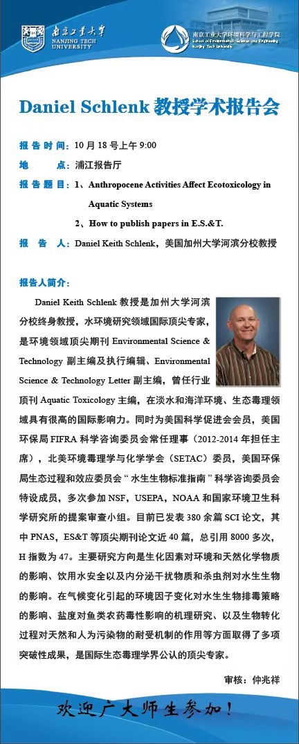 Daniel Keith Schlenk教授是加州大學河濱分校終身教授,水環(huán)境研究領(lǐng)域國際頂尖專家,是環(huán)境領(lǐng)域頂尖期刊Environmental Science& Technology副主編及執(zhí)行編輯、Environmental Science & Technology Letter副主編,曾任行業(yè)頂刊Aquatic Toxicology主編,在淡水和海洋環(huán)境、生態(tài)毒理領(lǐng)域具有很高的國際影響力。同時為美國科學促進會會員,美國環(huán)保局FIFRA科學咨詢委員會常任理事(2012-2014年擔任主席),北美環(huán)境毒理學與化學學會(SETAC)委員,美國環(huán)保局生態(tài)過程和效應(yīng)委員會“水生生物標準指南”科學咨詢委員會特設(shè)成員,多次參加NSF,USEPA,NOAA和國家環(huán)境衛(wèi)生科學研究所的提案審查小組。目前已發(fā)表380余篇SCI論文,其中PNAS,E.S.&T.等頂尖期刊論文近40篇,總引用8000多次,H指數(shù)為47。主要研究方向是生化因素對環(huán)境和天然化學物質(zhì)的影響、飲用水安全以及內(nèi)分泌干擾物質(zhì)和殺蟲劑對水生生物的影響。在氣候變化引起的環(huán)境因子變化對水生生物排毒策略的影響、鹽度對魚類農(nóng)藥毒性影響的機理研究、以及生物轉(zhuǎn)化過程對天然和人為污染物的耐受機制的作用等方面取得了多項突破性成果,是國際生態(tài)毒理學界公認的頂尖專家。