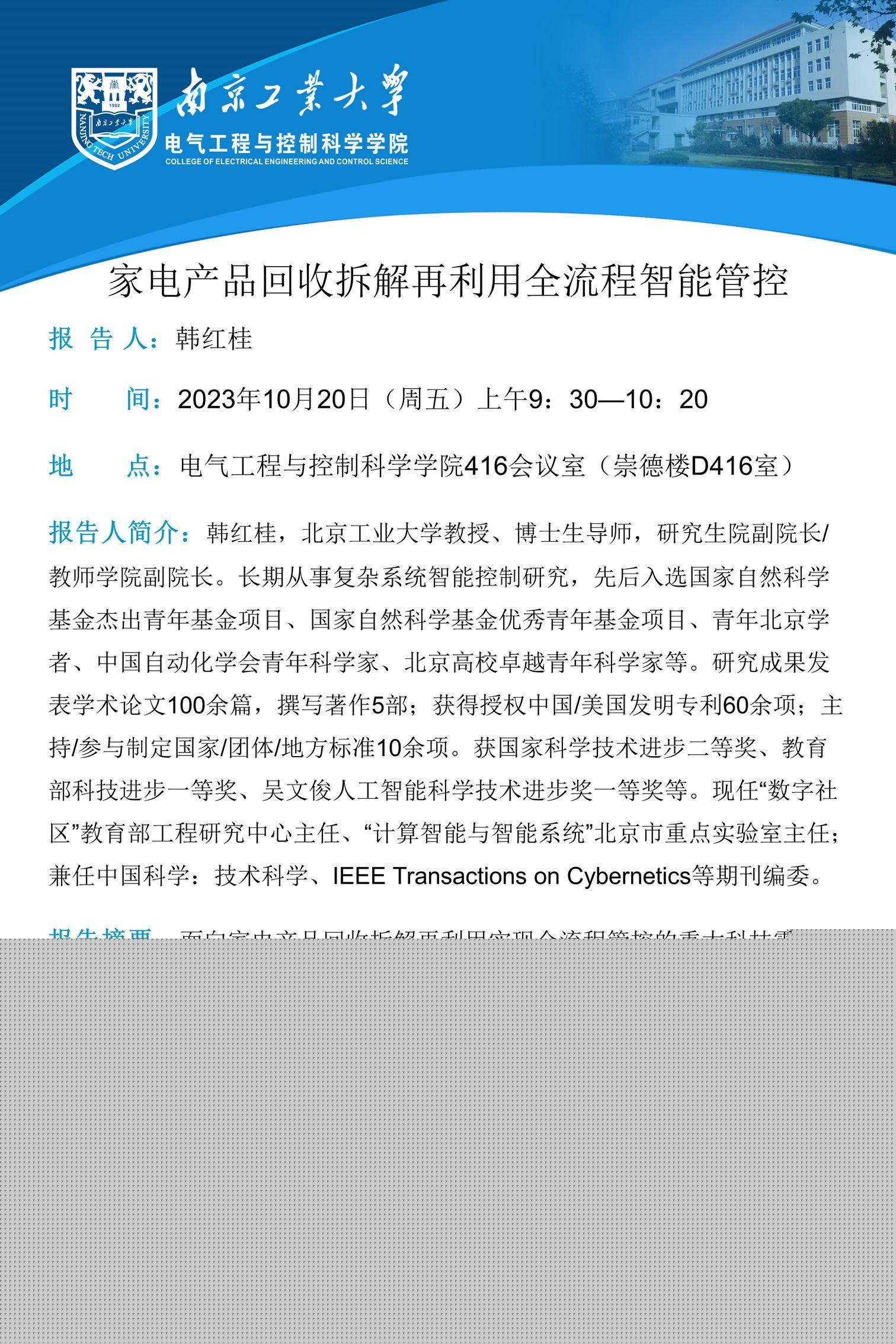 會議地點:電氣工程與控制科學學院416報告廳(崇德樓D座416)