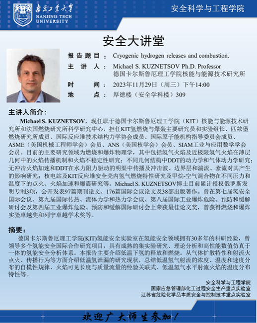 報(bào)告人簡(jiǎn)介:Michael S. KUZNETSOV,現(xiàn)任職于德國(guó)卡爾斯魯厄理工學(xué)院(KIT)核能與能源技術(shù)研究所和法國(guó)燃燒研究所科學(xué)研究中心,擔(dān)任KIT氫燃燒與爆轟主要研究員和實(shí)驗(yàn)組長(zhǎng)、匹茲堡燃燒研究所成員、國(guó)際反應(yīng)堆技術(shù)結(jié)構(gòu)力學(xué)協(xié)會(huì)成員、國(guó)際原子能機(jī)構(gòu)指導(dǎo)委員會(huì)成員、ASME(美國(guó)機(jī)械工程師學(xué)會(huì))會(huì)員、ANS(美國(guó)核學(xué)會(huì))會(huì)員、SIAM工業(yè)與應(yīng)用數(shù)學(xué)學(xué)會(huì)會(huì)員。1985年博士畢業(yè)于Leningrad Institute of Technology。Michael S. KUZNETSOV博士目前的主要研究領(lǐng)域?yàn)槿紵捅ㄎ锢韺W(xué),其中包括氫氣火焰及近極限氫氣火焰在薄層幾何中的火焰?zhèn)鞑C(jī)制和火焰不穩(wěn)定性研究;不同幾何結(jié)構(gòu)中DDT的動(dòng)力學(xué)和氣體動(dòng)力學(xué)研究;無(wú)沖擊火焰加速和DDT在水力阻力驅(qū)動(dòng)的明渠中傳播及沖擊波、邊界層和湍流、紊流對(duì)其產(chǎn)生的影響研究;核電站及KIT反應(yīng)堆安全殼內(nèi)氫氣燃燒特性研究及甲烷-空氣混合物在不同壓力和溫度下的點(diǎn)火、火焰加速和爆震研究等。Michael S. KUZNETSOV博士目前累計(jì)授權(quán)俄羅斯發(fā)明專(zhuān)利3項(xiàng),公開(kāi)發(fā)表97篇期刊論文、176篇國(guó)際會(huì)議論文及38部出版著作。Michael S. KUZNETSOV博士曾在第七屆氫安全國(guó)際會(huì)議、第九屆國(guó)際傳熱、流體力學(xué)和熱力學(xué)會(huì)議、第八屆國(guó)際工業(yè)爆炸危險(xiǎn)、預(yù)防和緩解研討會(huì)及第四屆工業(yè)爆炸危險(xiǎn)、預(yù)防和緩解國(guó)際研討會(huì)上榮獲最佳論文獎(jiǎng),還曾獲得燃燒和爆炸實(shí)驗(yàn)卓越獎(jiǎng)和列寧卓越學(xué)術(shù)獎(jiǎng)等。
