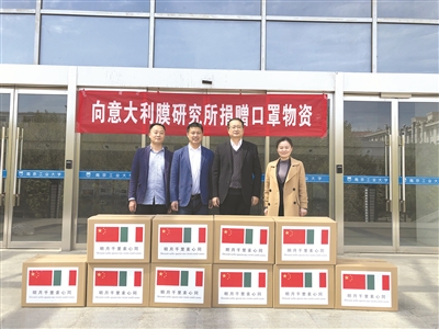本報(bào)訊近日,貼有中意兩國(guó)國(guó)旗、“明月千里素心同--Distani nello spazio, ma vicini conil cuore.” 中意雙語(yǔ)標(biāo)語(yǔ)的10箱口罩物資,從南京工業(yè)大學(xué)寄達(dá)意大利。