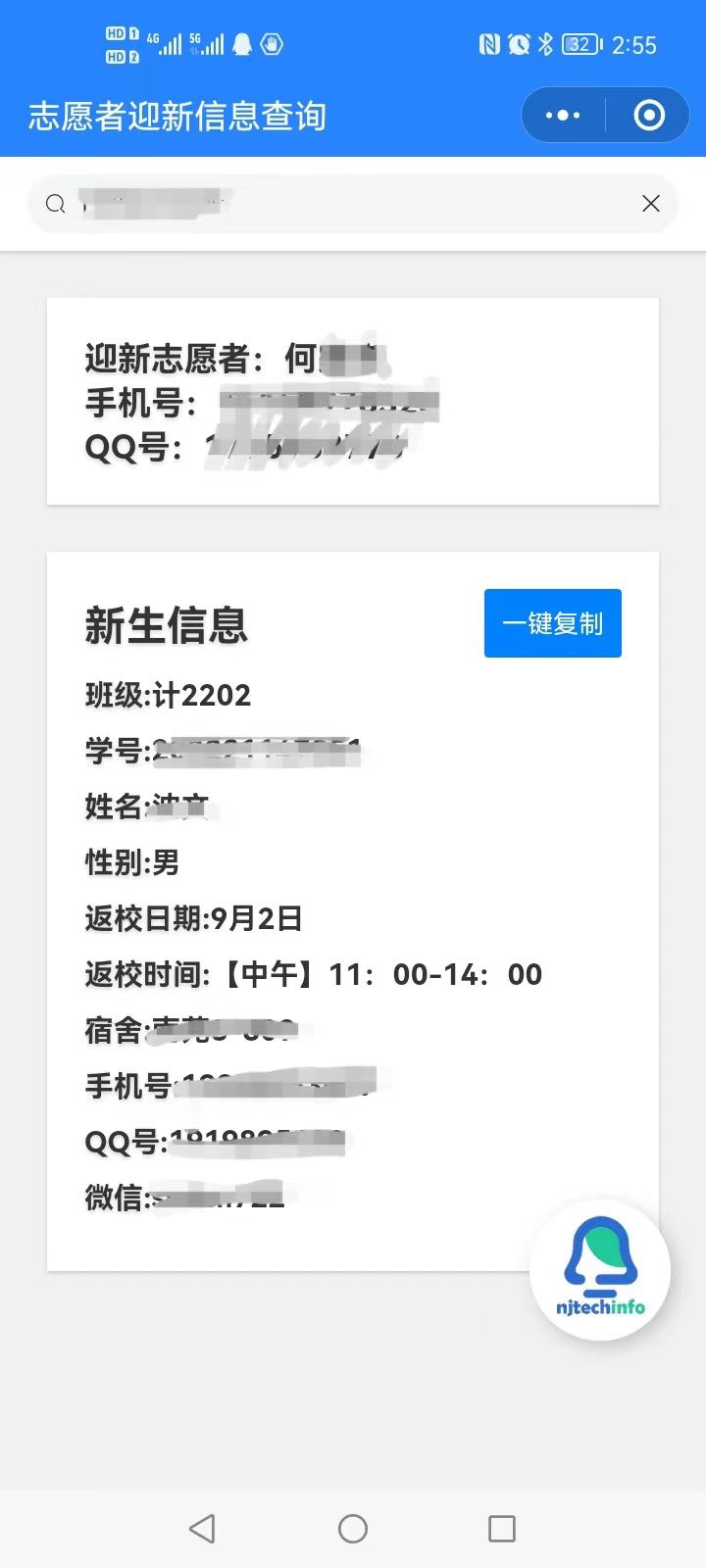 開學一周前,南工大計算機學院計嵌2201班黃淇軒在“南工search”小程序上輸入自己的手機號,一對一志愿服務學長的姓名、手機號和QQ號便立馬彈了出來。“輔導員給我們推薦了這款小程序,我很快就找到了自己一對一的學長志愿服務者,張學長給我發了學校定位,幫我提前規劃了報到路線,還給我介紹了學院和專業,希望我以后也可以設計出這樣的小程序!” 黃淇軒興奮地說道。