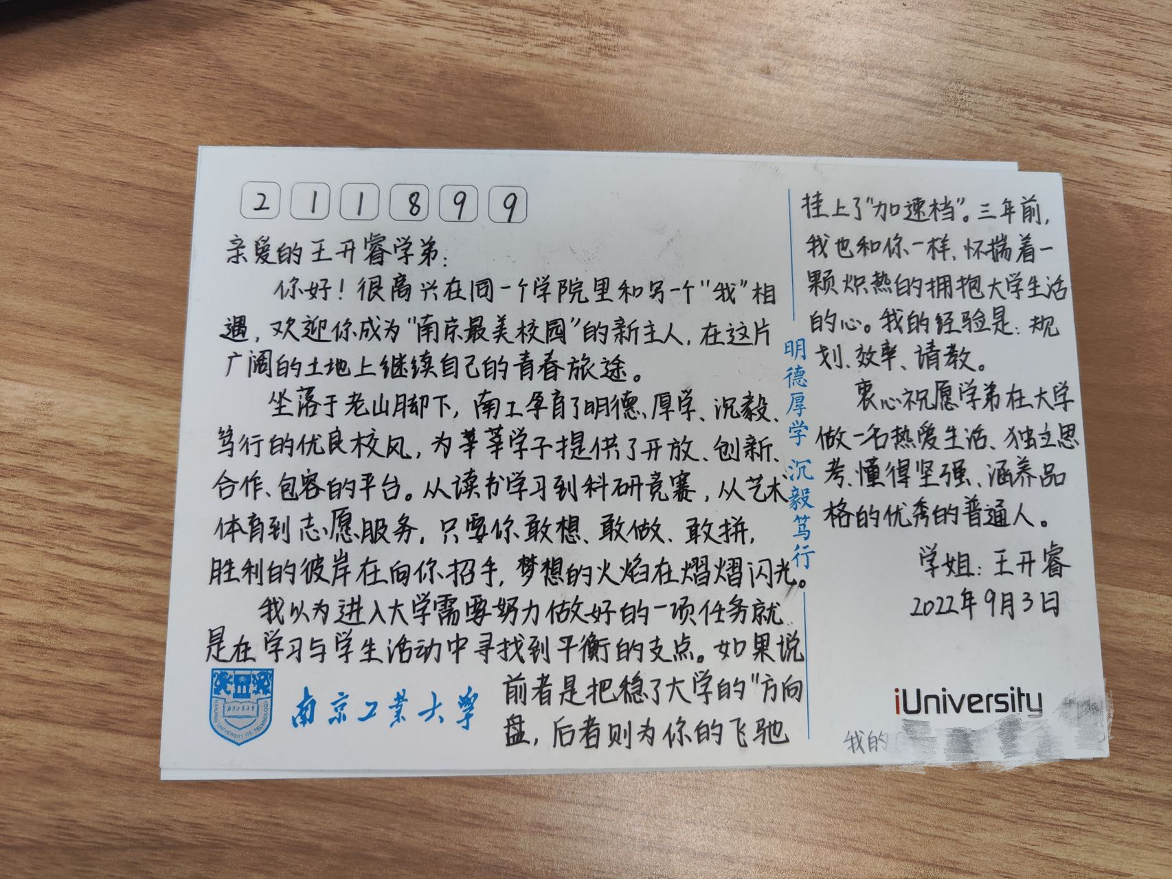 一個盲盒、一封信、一件T恤,學弟王開睿被學姐王開睿領到報到點后,又收到了一份驚喜。“親愛的王開睿學弟,你好……從讀書學習到科研競賽,從體育藝術到志愿服務,只要你敢想、敢做、敢拼,勝利的彼岸就在不遠方……”打開信封后的學弟王開睿一字一句默念著學姐的鼓勵和祝福,很是振奮,“遇到同名同姓的學姐已是緣份,沒想到學姐還特意為我手寫了明信片,句句鼓勵的話,讓人倍受振奮。”