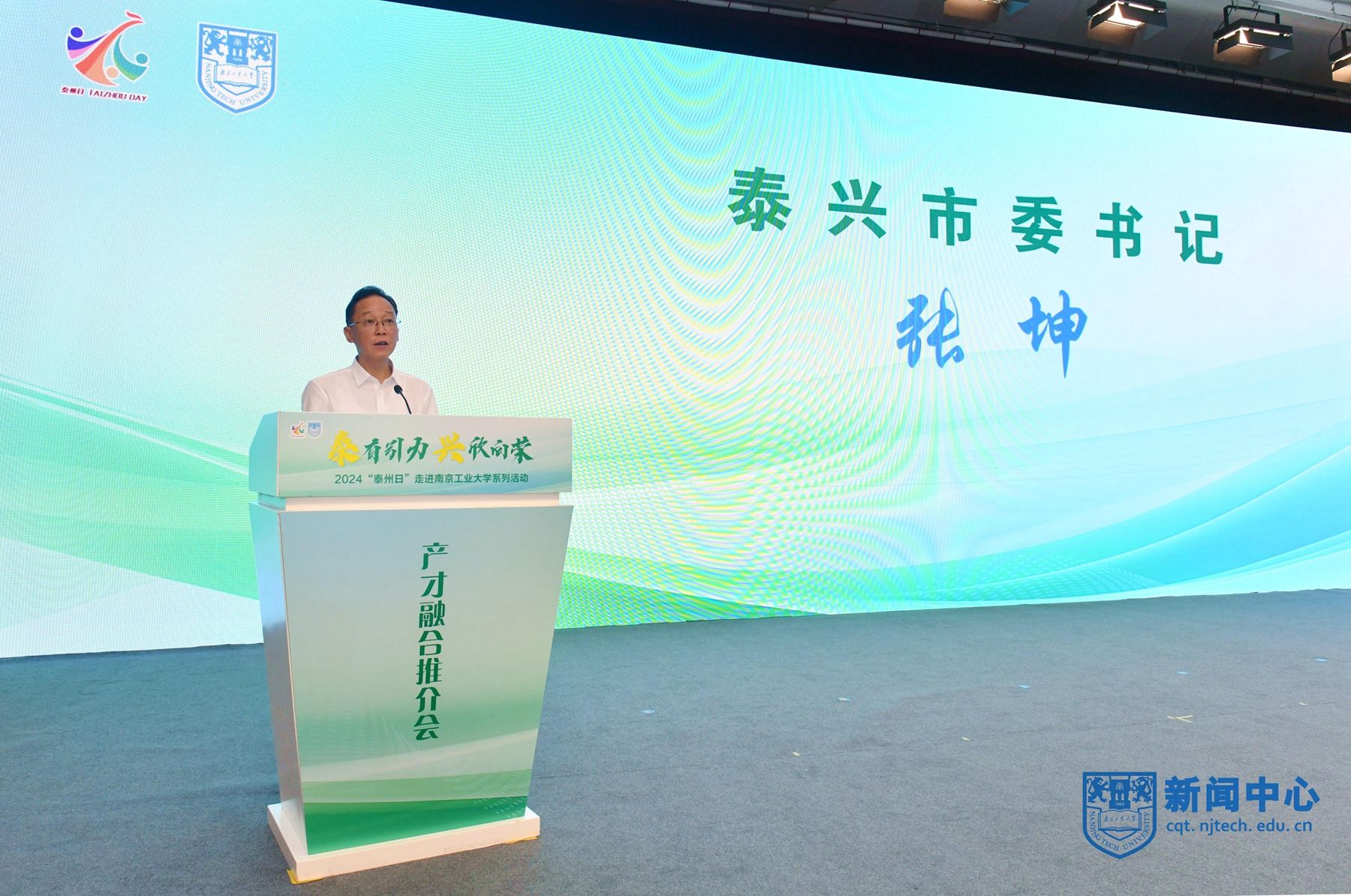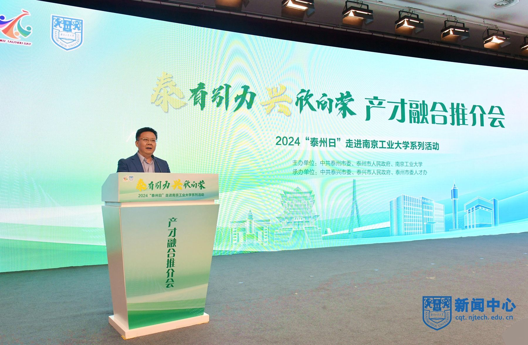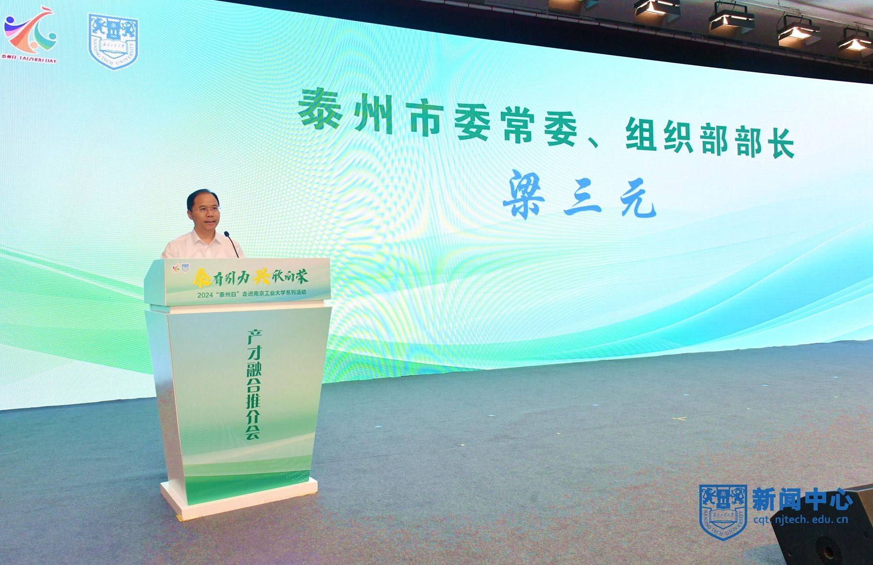 蔣軍成致辭,他指出,我校與泰州長(zhǎng)期同頻共振,形成了“你中有我、我中有你”的融合發(fā)展新格局,學(xué)校先后與姜堰區(qū)、泰興市簽訂戰(zhàn)略合作協(xié)議,共建了泰州(南京)區(qū)域離岸創(chuàng)新中心、泰興產(chǎn)業(yè)學(xué)院等產(chǎn)學(xué)研合作平臺(tái),一大批優(yōu)秀畢業(yè)生選擇泰州、扎根泰州、建功泰州,一大批科研成果在泰州相關(guān)產(chǎn)業(yè)領(lǐng)域?qū)崿F(xiàn)轉(zhuǎn)移轉(zhuǎn)化、投產(chǎn)應(yīng)用。“泰州日”活動(dòng)再次走進(jìn)南工大,這不僅是雙方友誼的延續(xù)、情感的升華,更為我校積極融入泰州發(fā)展、提升服務(wù)能級(jí)、彰顯價(jià)值追求,搭建了重要平臺(tái)和有效渠道。學(xué)校將以此次活動(dòng)為契機(jī),為高素質(zhì)人才培養(yǎng)匯集合力,為高水平科技創(chuàng)新增添活力,為高品質(zhì)成果轉(zhuǎn)化激發(fā)動(dòng)力。