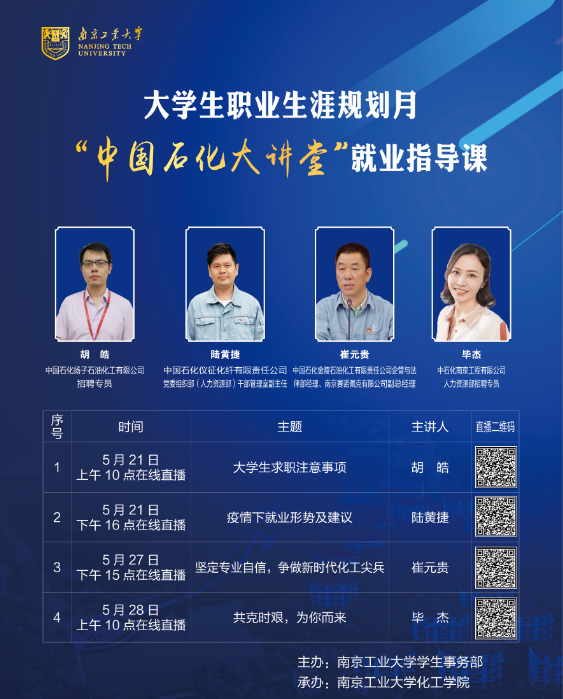 “中國(guó)石化大講堂”是我校直面疫情影響下的就業(yè)形勢(shì),為在校大學(xué)生提供的高端就業(yè)指導(dǎo)服務(wù)。后續(xù)還將有中國(guó)石化金陵石化有限公司、中國(guó)石化南京工程有限公司的專家為學(xué)生提供優(yōu)質(zhì)就業(yè)指導(dǎo)服務(wù),幫助學(xué)生了解石化行業(yè)的未來發(fā)展,更好地服務(wù)學(xué)生擇業(yè)就業(yè)。