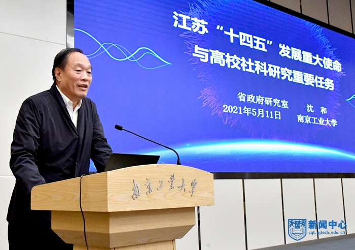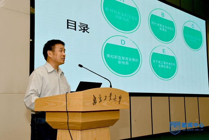 江蘇省政府研究室副主任沈和、江蘇省社科聯研究室主任、智庫研究與交流中心主任劉西忠受邀作專題報告,深刻闡述了“十四五”期間經濟社會發展對高校社科研究和智庫建設提出的新要求、新使命,為我校哲學社科事業發展擘畫了坐標、指明了方向。南京信息工程大學張慧明教授分享了理工科高校建設人文社科交叉研究型智庫的路徑,為我校智庫建設提供了可資借鑒的建議。社會科學處處長、科學研究院副院長陳紅喜報告了我校社科研究和基地智庫的建設現狀與發展方向。