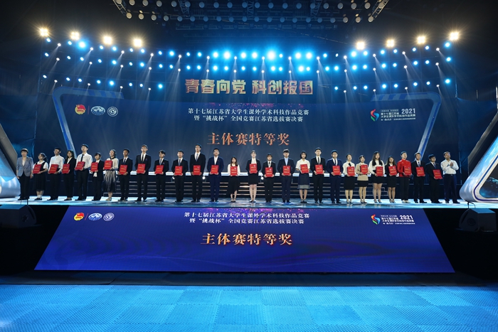 5月14日至15日,由共青團江蘇省委、江蘇省教育廳、江蘇省科學技術協會、江蘇省學生聯合會主辦的第十七屆“挑戰杯”全國大學生課外學術科技作品競賽江蘇省選拔賽決賽在南京中醫藥大學舉行。副省長陳星鶯,團省委、省教育廳、省科協、省學聯、南京市政府相關領導以及來自全省各高校的參賽師生參加相關活動。我校參賽作品獲得特等獎2項、二等獎6項、三等獎2項,5件作品成功推報國賽,學校榮獲“優勝杯”。