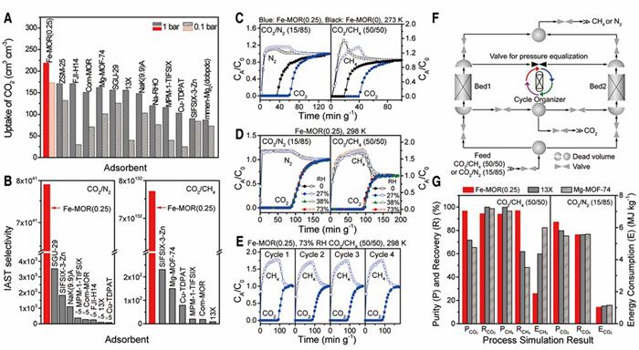 (上)雜原子絲光沸石一維孔道篩分CO2, Ar, N2和CH4的示意圖。(下)氣體吸附分離性能:(A) 298 K時CO2體積吸收量;(B) CO2/N2:15/85和CO2/CH4:50/50二元混合物在1 bar和298 K下的CO2/N2和CO2/CH4分離選擇性;(C-E) CO2/N2(CH4)穿透曲線;(F) 2-床VSA工藝的流程示意圖和(G) ASPEN模擬結果。
