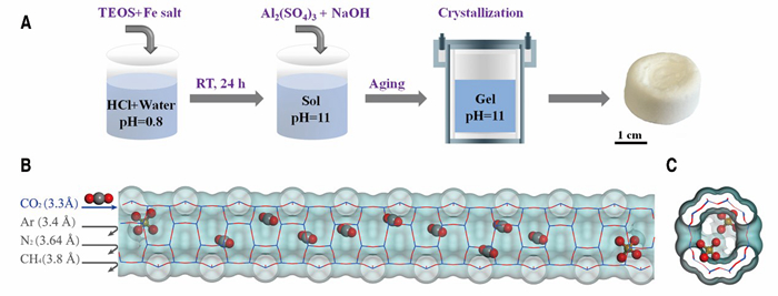 針對這一難題,王軍教授團隊開發了雜原子沸石分子篩水熱合成新路線,合成出結構獨特的含鐵雜原子絲光沸石分子篩單塊材料,無需任何后處理即可直接作為自成型物理吸附劑,表現出迄今為止最高的CO2體積吸附容量和分離效率,對氬氣(Ar),氮氣(N2)以及甲烷(CH4)表現出良好的分子篩分能力,具有優異的抗水汽性能,實現了對燃燒后(CO2和N2分離)、沼氣以及天然氣純化(CO2和CH4分離)等體系中CO2的高效吸附分離。審稿人評價,這一研究是碳捕集領域的重大突破,具有明顯的實際應用潛力,開拓了雜原子沸石分子篩在氣體吸附分離領域的新應用。