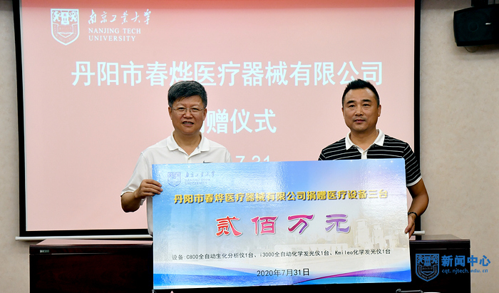 7月31日下午,學校舉行抗疫物資捐贈儀式,丹陽市春燁醫療器械有限公司再次向我校捐贈價值兩百萬元的醫療設備。校黨委書記芮鴻巖、基金會理事長高明代表學校接受捐贈。丹陽市春燁醫療器械有限公司總經理毛燁、丹陽市委第四指導組副組長蔡振宇、無錫校友會和江陰校友會校友代表出席捐贈儀式。儀式由教育發展基金會副秘書長凌紅主持。