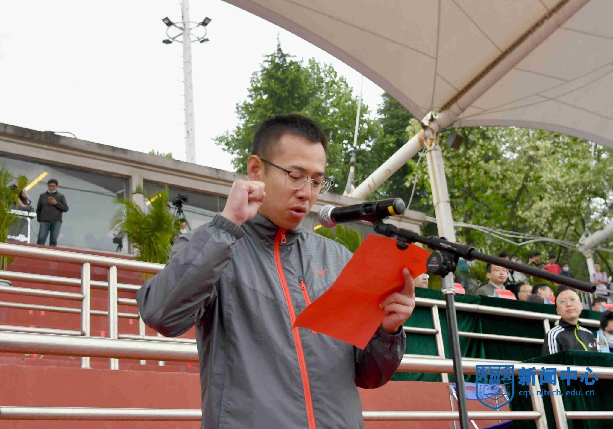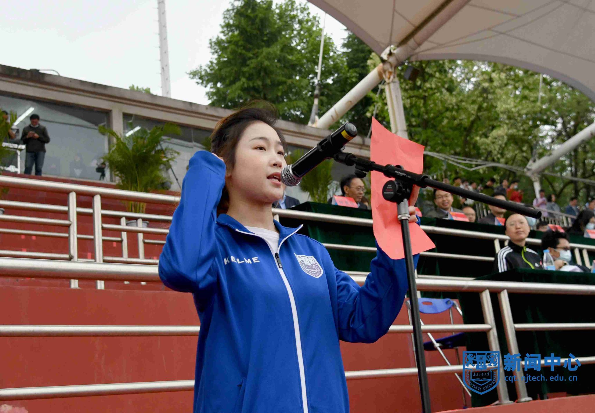 在升國旗和校旗儀式之后,經濟與管理學院工管2103班朱舒同學和體育學院王鑫老師分別代表全體運動員和裁判員宣誓。