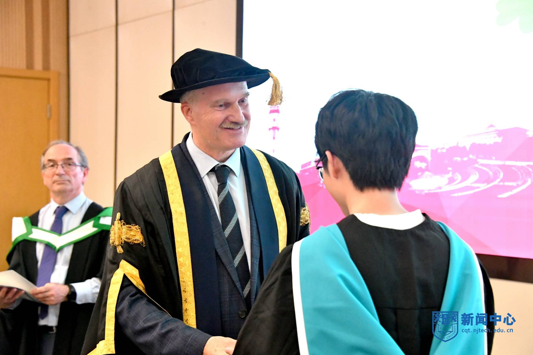 典禮開始,海外教育學院院長王志榮宣讀本屆畢業生名單,蔣軍成校長和David FitzPatrick校長為畢業生逐一頒發兩校學位證書,并合影留念。畢業生代表、電子信息工程(國)1902班趙懷逸同學與即將出國學生代表、制藥工程(國)2002班尹成泰同學先后發言,表達了對學校傾心培養的感激之情。