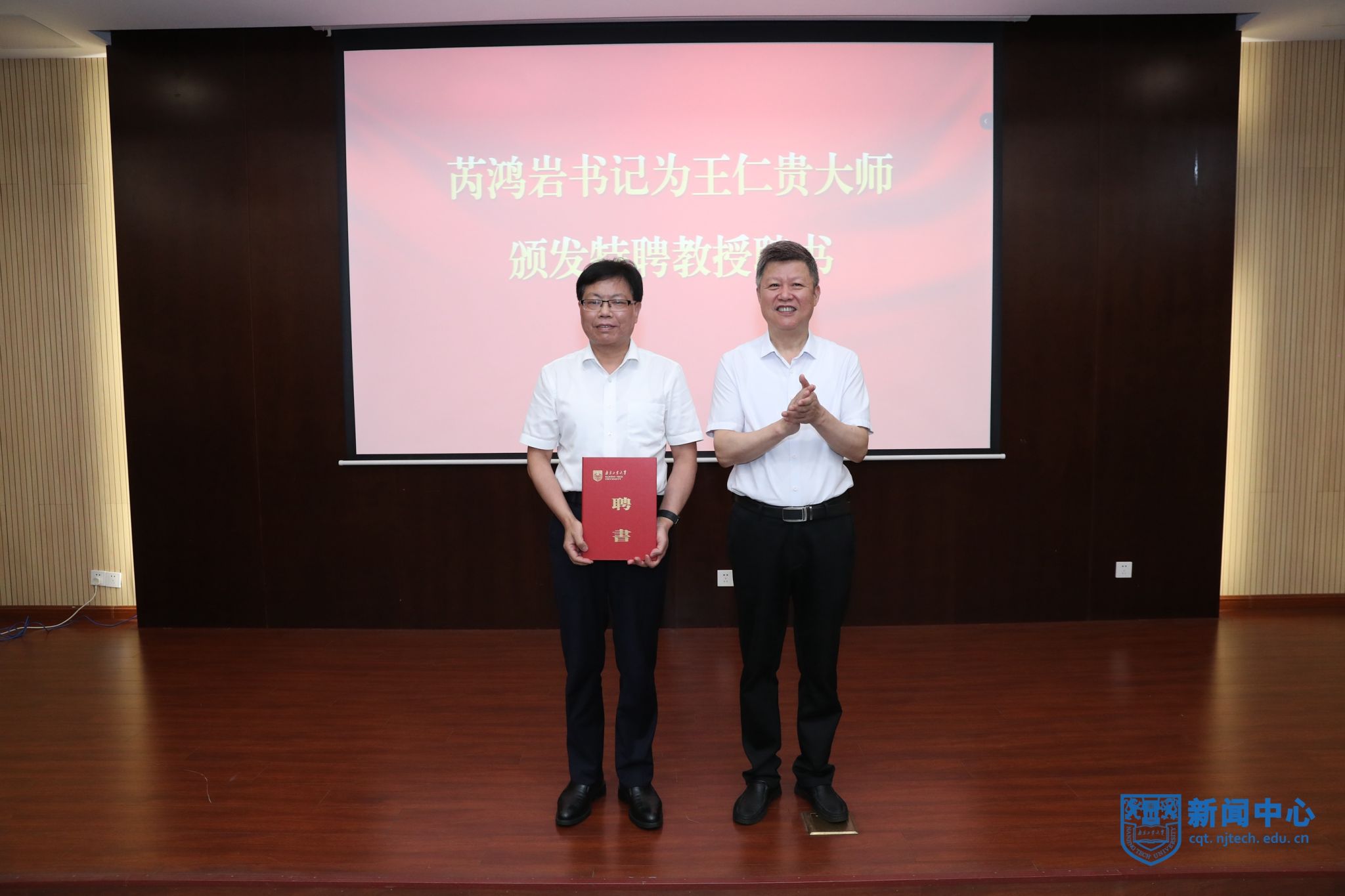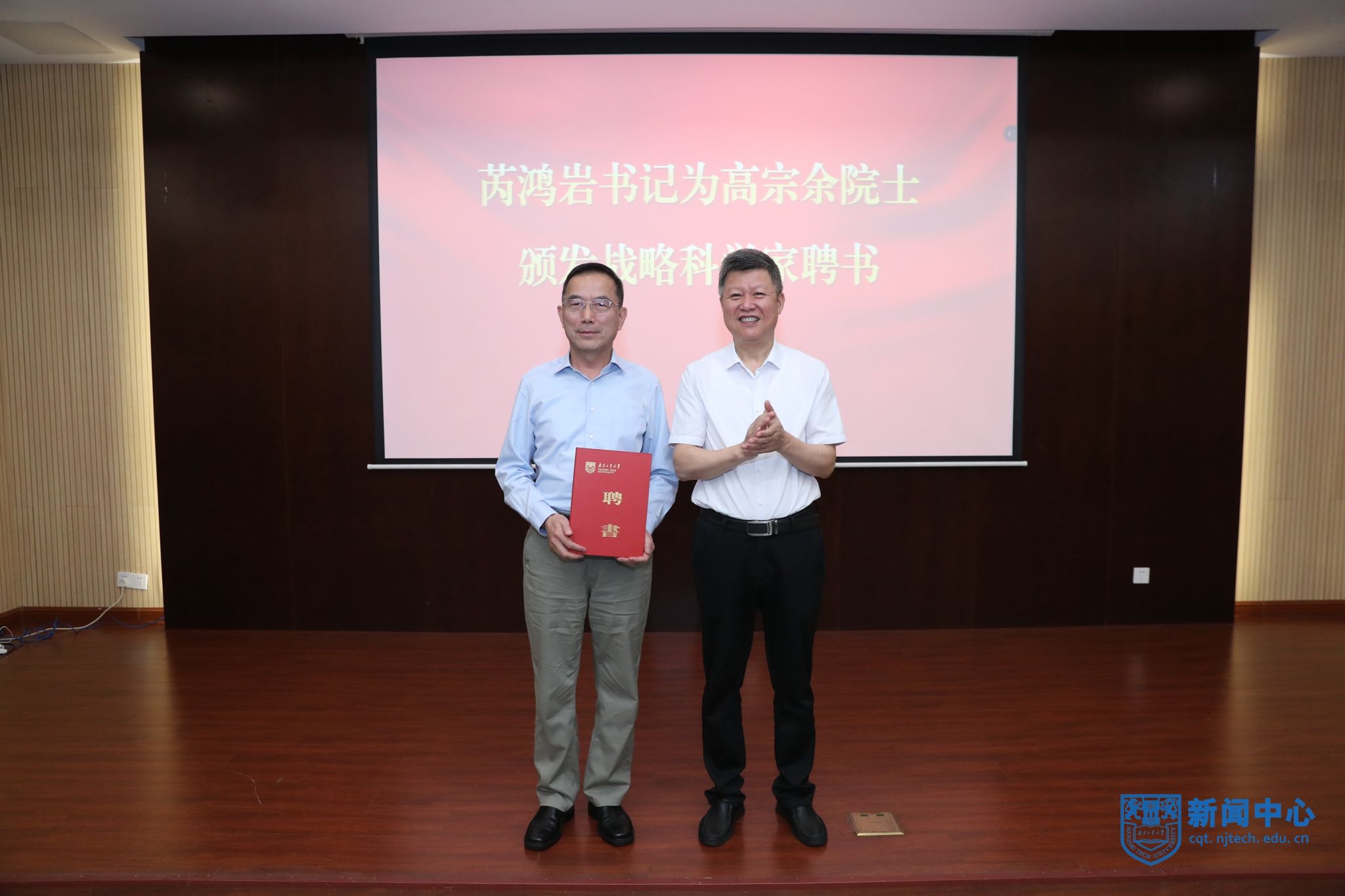 人事處副處長楊洪俊介紹高宗余院士、王仁貴大師、莊勇副總經理的個人簡介及主要成就。芮鴻巖書記為高宗余院士頒發戰略科學家聘書,為王仁貴大師、莊勇副總經理頒發特聘教授聘書。學生代表為三位專家佩戴校徽并獻花。